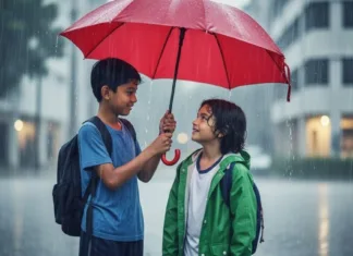 Petang itu hujan turun lebat. Aiman berdiri di depan sekolah sambil memeluk begnya erat-erat. Dia tunggu mak yang belum sampai lagi.